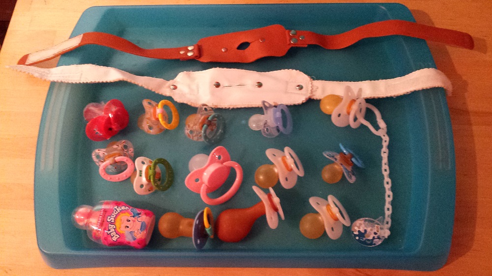 Zum Beruhigen bekommt mein Adult Baby einen Schnuller und einen Teddy.