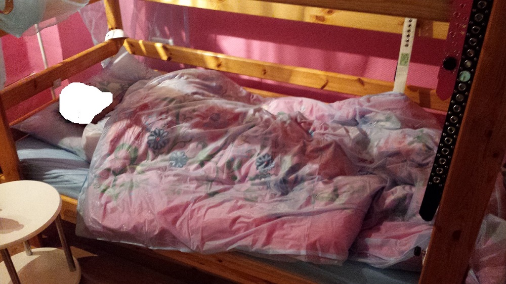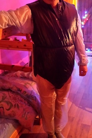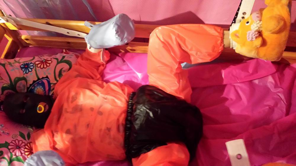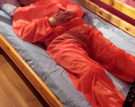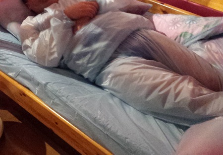 Windelliebhaber im PVC Schwitzanzug in PVC Bettwäsche.